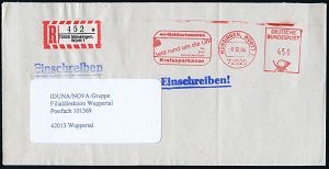 4705 | 12 € | POSTLEITRAUM 7400 (OHNE REUTLINGEN u. TÜBINGEN) : 72525 MÜNSINGEN,WÜRTT 1/ ec-Geldautomaten../ Kreissparkasse 1994 (8.12.) AFS Postalia 450 Pf. + RZ: 72525 Münsingen,/Württ 1/a (Bf. schwache Falte) Fern-R-Bf. (Dü.E-26B) | ![]() | |