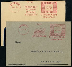 4602 | 22 € | POSTLEITRAUM 7400 (OHNE REUTLINGEN u. TÜBINGEN) : BALINGEN/ "Behriba"../ C.F.Behr Nachf. 1931/34 2 verschiedene AFS "Mäanderrechteck" (= Tetil-Firma) je klar auf Vorderseite bzw. Teil-Vorderseite, 2 Belege (Dü.E-2CEh) | ![]() | |
