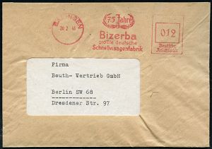 4605 | 25 € | POSTLEITRAUM 7400 (OHNE REUTLINGEN u. TÜBINGEN) : BALINGEN/ 75 Jahre/ Bizerba/ größte deutsche/ Schnellwaagenfabrik 1946 (20.2.) aptierter Jubil.-AFS Francotyp "Reichsadler" = entfernt = Notmaßnahme! (Lorbeer) Fern-Bf. (Dü.E-13 J-129o) | ![]() ![]() | |