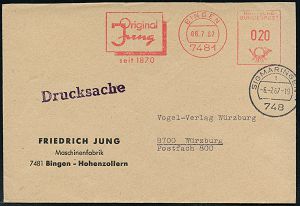 4613 | 10 € | POSTLEITRAUM 7400 (OHNE REUTLINGEN u. TÜBINGEN) : 7481 BINGEN/ Original/ Jung/ seit 1870 1967 (6.7.) AFS Francotyp "Posthorn" + 1K-Segment: 748 SIGMARINGEN/l , (Bf. fehlt rs. Klappe) Firmen-Fernbf.: FRIEDRICH JUNG, Maschinenfabrik.. (Dü.E-26) | ![]() | |