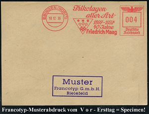 4624 | 35 € | POSTLEITRAUM 7400 (OHNE REUTLINGEN u. TÜBINGEN) : EBINGEN (WÜRTT)/ Trikotagen../ 1897-1937/ 40 Jahre/ Friedrich Maag 1936 (18.12.) Jubil.-AFS-Musterabdruck Francotyp "Reichsadler" (Firmen-Logo) glasklar gest. Francotyp-Musterblatt vom V o r -Ersttag! (mit Attest), selten! (Dü.E-5CGo) | ![]() ![]() | |