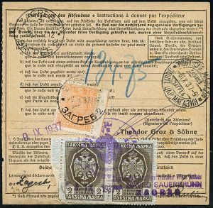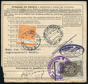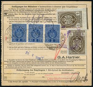4627 | 25 € | POSTLEITRAUM 7400 (OHNE REUTLINGEN u. TÜBINGEN) : EBINGEN (Württ)/ Gebühr bezahlt 1939 (19.5.) Doppeloval-PFS + schw. Selbstbucher-Paketzettel: Ebingen (Württ)/ Hartner + TS: VILLACH, Ausl.-Selbstbucher-Paket-Kt. n. Zagreb, rs. jugoslaw. Tax- u. Fiskalmarken (Dü.A-5, Nr.20 ohne Sterne) | ![]() ![]() | |