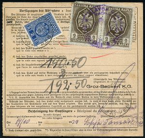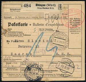 4628 | 28 € | POSTLEITRAUM 7400 (OHNE REUTLINGEN u. TÜBINGEN) : EBINGEN (WÜRTT)/ Gebühr bezahlt 1939 (30.9.) Doppeloval-PFS + schw. Selbstbucher-Paketzettel: Ebingen (Württ)/ Groß-Beckert KG. (= Nadelfabrik) + TS: VILLACH, Ausl.-Selbstbucher-Paket-Kt. n. Zagreb, rs. jugoslaw. Tax- u. Fiskalmarken, = 1. Kriegsmonat des II. Weltkrieges! (Dü.A-5, Nr.20 ohne Sterne) | ![]() ![]() | |