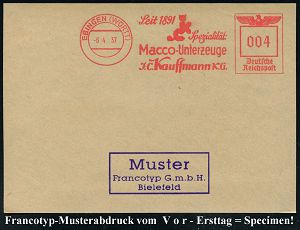 4629 | 35 € | POSTLEITRAUM 7400 (OHNE REUTLINGEN u. TÜBINGEN) : EBINGEN (WÜRTT)/ Seit 1891/ ..Macco-Unterzeuge/ J.C.Kauffmann KG 1937 (6.4.) AFS-Musterabdruck Francotyp "Reichsadler" (Firmen-Logo) glasklar gest. Francotyp-Musterblatt vom V o r - Ersttag! (mit Attest), selten! (Dü.E-5CGo) | ![]() ![]() | |