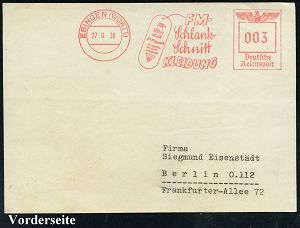 4631 | 14 € | POSTLEITRAUM 7400 (OHNE REUTLINGEN u. TÜBINGEN) : EBINGEN (WÜRTT)/ FM/ Schlank/ Schnitt/ Kleidung 1938 (27.9.) AFS Francotyp "Reichsadler" (Etikett) kleine Bedarfs-Vorderseite (Dü.E-5CG) | ![]() | |
