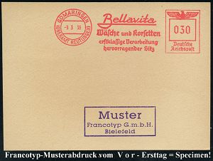4643 | 35 € | POSTLEITRAUM 7400 (OHNE REUTLINGEN u. TÜBINGEN) : GOMARINGEN/ (OBERAMT REUTLINGEN)/ Bellavita/ Wäsche u.Korsetten.. 1938 (9.3.) AFS-Musterabdruck Francotyp "Reichsadler" , glasklar gest. Francotyp-Musterblatt vom V o r - Ersttag! (mit Attest), selten! (Dü.E-5CGo) | ![]() ![]() | |