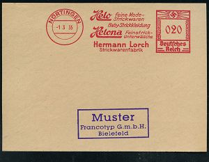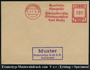 4646 | 35 € | POSTLEITRAUM 7400 (OHNE REUTLINGEN u. TÜBINGEN) : HECHINGEN/ ::Hohenzollernsche/ Trikotwarenfabrik/ Carl Grotz 1934 (13.4.) AFS-Musterabdruck Francotyp "Hakenkreuz" , glasklar gest. Francotyp-Musterblatt vom V o r - Ersttag! (mit Attest), selten! (Dü.E-3CEo) | ![]() ![]() | |