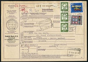 4652 | 15 € | POSTLEITRAUM 7400 (OHNE REUTLINGEN u. TÜBINGEN) : 7455 JUNGINGEN/ b 1965 (27.7.) 1K-Segment auf 3er-Streifen 2.- DM Gerh. Hauptmann u.a. + brauner Paketzettel: 7455 Jungingen, klar gest. Ausl.-Paket-Kt. (rs. unsichtbare Mäng.) n. Gent, Belgien, Porto 645 Pf. (Mi.362 3x u.a.) | ![]() | |