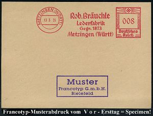 4657 | 35 € | POSTLEITRAUM 7400 (OHNE REUTLINGEN u. TÜBINGEN) : METZINGEN (WÜRTT)/ Rob.Bräuchle/ Lederfabrik/ Gebr.1873.. 1935 (13.3.) AFS-Musterabdruck Francotyp "Hakenkreuz" , glasklar gest. Francotyp-Musterblatt vom V o r - Ersttag! (mit Attest), selten! (Dü.E-3CEo) | ![]() ![]() | |