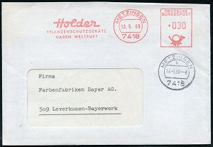 4662 | 12 € | POSTLEITRAUM 7400 (OHNE REUTLINGEN u. TÜBINGEN) : 7418 METZINGEN/ Holder/ PFLANZENSCHUTZGERÄTE.. 1968 (13.5.) AFS Francotyp "Posthorn" + 1K-Segment: 7418 METZINGEN/b (vom 14.5., da Datum im AFS offensichtlich falsch) rs. Abs.-Vordruck, Fern-Bf. (Dü.E-26) | ![]() ![]() | |