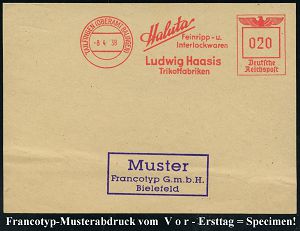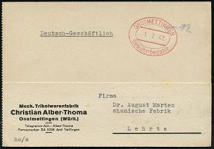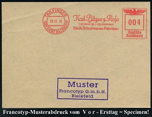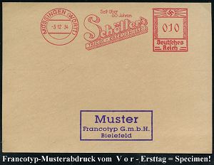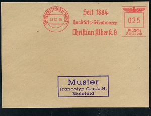 4726 | 35 € | POSTLEITRAUM 7400 (OHNE REUTLINGEN u. TÜBINGEN) : ONSTMETTINGEN (WÜRTT)/ Seit 1884/ Qualitäts-Trikotwaren/ Christian Alber KG 1936 (23.12.) AFS-Musterabdruck Francotyp "Reichsadler" , glasklar gest. Francotyp-Musterblatt vom V o r - Ersttag! (mit Attest), selten! (Dü.E-5CGo) | ![]() ![]() | |