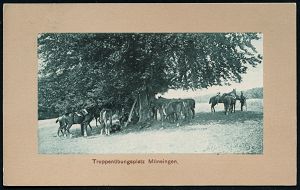 4669 | 12 € | POSTLEITRAUM 7400 (OHNE REUTLINGEN u. TÜBINGEN) : MÜNSINGEN (WÜRTT.)/ *ÜBUNGSPLATZ* 1911 (21.4.) 1K = Hauspostamt Truppenübungsplatz auf s/w.-Foto-Ak.: Truppenübungsplatz Münsingen (Militärpferde im Schatten eines Baumes) n. Bad Cannstatt | ![]() ![]() | |