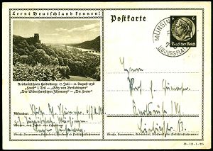 4704 | 18 € | POSTLEITRAUM 7400 (OHNE REUTLINGEN u. TÜBINGEN) : MÜNSINGEN (WÜRTT.)/ ÜBUNGSPLATZ 1939 (8.2.) alter 1K mit entfernten Sternen (Rahmen gebrochen) + hs. Abs.: "..Trupp. Übg.Platz Münsingen, Lager.." , klar gest. Bedarfs-BiP 6 Pf. Hindenbg., braun: Reichsfestspiele Heidelberg.. "Faust" I. Teil, "Götz v. Berlichingen".. mit viel Text, seltene Verwendung! (Mi.P 236/38-112) | ![]() | |