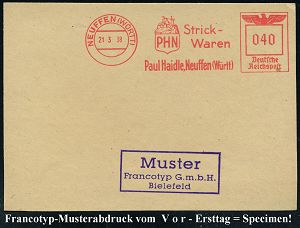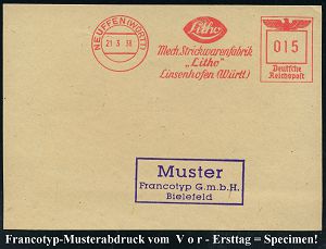 4709 | 35 € | POSTLEITRAUM 7400 (OHNE REUTLINGEN u. TÜBINGEN) : NEUFFEN (WÜRTT)/ Litho/ Mech.Strickwarenfabrik/ ..Linsenhofen 1938 (21.3.) AFS-Musterabdruck Francotyp "Reichsadler" (Firmen-Logo) glasklar gest. Francotyp-Musterblatt vom V o r - Erstag! (mit Attest), selten! (Dü.E-5CGo) | ![]() ![]() | |