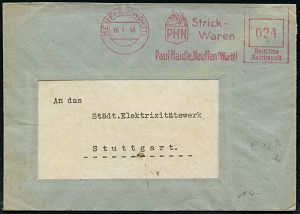 4708 | 25 € | POSTLEITRAUM 7400 (OHNE REUTLINGEN u. TÜBINGEN) : NEUFFEN (WÜRTT)/ PHN/ Strick-/ Waren/ Paul Haidle.. 1948 (15.1.) apierter AFS Francotyp "Reichsadler" = entfernt = Notmaßnahme! (Monogr.-Logo mit Burg) Fern-Bf., vergl. Kat.-Nr. 4707 (Dü.E-13 J-129o = relativ spätes Datum!) | ![]() | |