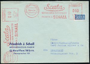 4710 | 15 € | POSTLEITRAUM 7400 (OHNE REUTLINGEN u. TÜBINGEN) : (14a) NEUFFEN (WÜRTT)/ Scala/ SCHIEBLEHREN-MIKROMETER/ FRIEDRICH J:SCHALL 1954 (29.4.) AFS Francotyp "Posthorn" 010 Pf. + 010 Pf. = 2 Abdrucke , 1x auf 2 Pf. NoB (= Vorausentwertung) Firmen-Fernbf.: Friedr. J. Schall, MESSWERKZEUG-FABRIK.. (Dü.E-23CO) | ![]() | |