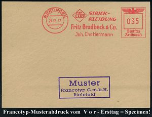 4714 | 35 € | POSTLEITRAUM 7400 (OHNE REUTLINGEN u. TÜBINGEN) : NÜRTINGEN/ Efbe/ STRICK-/ KLEIDUNG/ Fritz Brodbeck & Cio.. 1937 (29.12.) AFS-Musterabdruck Francotyp "Reichsadler" (Monogr.-Logo) glasklar gest. Francotyp-Musterblatt vom V o r - Ersttag ! (mit Attest), selten! (Dü.E-5CGo) | ![]() ![]() | |