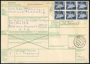 4722 | 18 € | POSTLEITRAUM 7400 (OHNE REUTLINGEN u. TÜBINGEN) : 744 NÜRTINGEN 3/ a 1976 (3.12.) 1K-Segment mehrfach auf 6er-Block 500 Pf. Radioteleskop + desgl. 4er-Block rs. + 10 Pf. Technik + brauner Paketzettel: 744 Nürtingen 3, klar gest. Übersee-Paket-Kt. n. USA, seltene Portostufe 5010 Pf.! (Mi.859 10 x u.a.) | ![]() ![]() | |