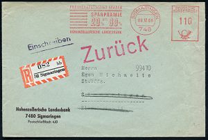4799 | 16 € | POSTLEITRAUM 7400 (OHNE REUTLINGEN u. TÜBINGEN) : 748 SIGMARINGEN/ ..SPARPRÄMIE/ 20% BIS 30%/ HOHENZOLLERNSCHE LANDESBANK 1966 (9.12.) AFS Francotyp "Posthorn" 110 Pf. + RZ: 748 Sigmaringen/bb + roter 1L: Zurück, Inl.-Retour-R-Bf.; Hohenzollernsche Landesbank (Dü.E-26) | ![]() | |