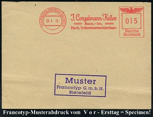 4815 | 35 € | POSTLEITRAUM 7400 (OHNE REUTLINGEN u. TÜBINGEN) : TAILFINGEN (OBERAMT BALINGEN)/ J.Conzelmann-Keller/ KG/ Mech.Trikotwarenfabriken 1938 (20.4.) AFS-Musterabdruck Francotyp "Reichsadler" , glasklar gest. Musterblatt vom V o r - Ersttag ! (mit Attest), selten! (Dü.E-5CGo) | ![]() ![]() | |