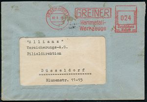 4826 | 20 € | POSTLEITRAUM 7400 (OHNE REUTLINGEN u. TÜBINGEN) : URACH (WÜRTT)/ GREINER/ Hartmetall-/ Werkzeuge 1946 (2.8.) aptierter AFS Francotyp "Hakenkreuz" = entfernt = Notmaßnahme! (schwach fleckig) rs. Abs.-HdN, Fern-Bf. (Dü.E-12 K-100o = seltene Type) | ![]() | |