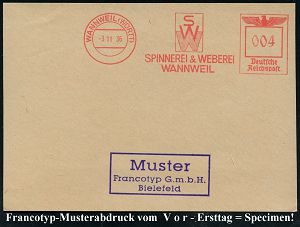 4827 | 35 € | POSTLEITRAUM 7400 (OHNE REUTLINGEN u. TÜBINGEN) : WANNWEIL (WÜRTT)/ SWW/ SPINNEREI & WEBEREI/ WANNWEIL 1936 (3.11.) AFS-Musterabdruck Francotyp "Reichsadler" (Monogr.-Logo) glasklar gest. Francotyp-Musterblatt vom V o r - Ersttag ! (mit Attest), selten! (Dü.E-5CEo) | ![]() ![]() | |