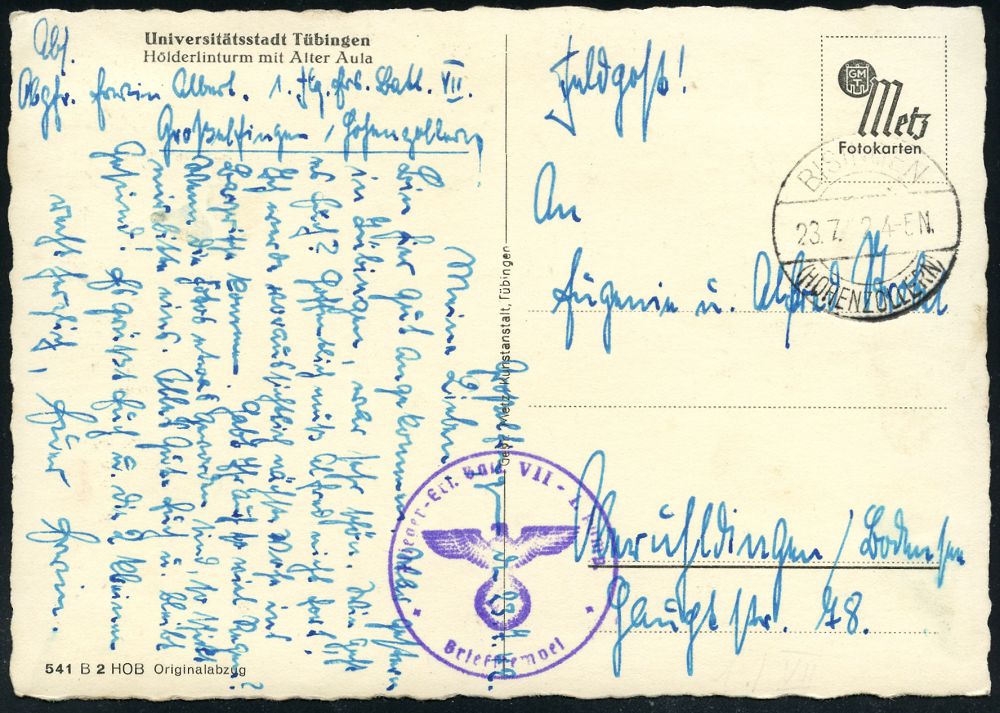 4614 | 12 € | POSTLEITRAUM 7400 (OHNE REUTLINGEN u. TÜBINGEN) : BISINGEN/ (HOHENZOLLERN) 1942 (23.7.) 1K-Brücke + viol. 1K-HdN: Flieger-Ers. Batl. VII - 1. Komp. + hs. Abs., Feldpost-Ak.: Hölderlinturm u. Alte Aula n. Oberuhldingen | ![]() ![]() | |