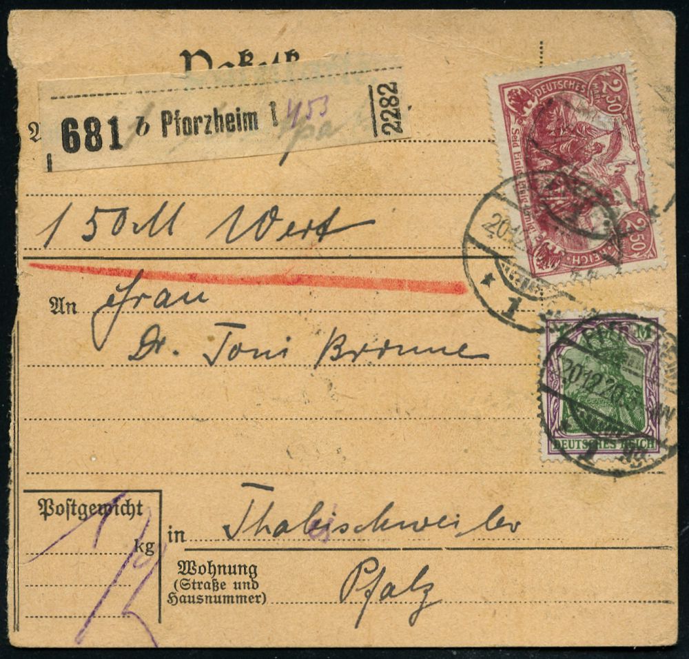 5208 | 16 € | 7530 PFORZHEIM : PFORZHEIM/ *1gg 1920 (20.12.) 1K-Gitterbrücke auf Germania 2,50 Mk. u. 1 Mk. + schw. Paketzettel: b Pforzheim 1 , sauber gest. Inl.-Werpaketkt. 150.- M. (Mi.115, 150) | ![]() | |