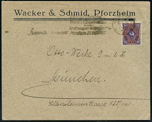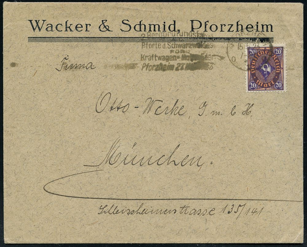 5209 | 20 € | 7530 PFORZHEIM : PFORZHEIM/ o1o/ 2.Bergprüfungsfahrt/ ..FÜR/ Kraftwagen Motorräder/ ..27.Mai 1923 (15.5.) seltener MWSt (teils etw. verwischt) auf Firmen-Bf.: Wacker & Schmid.. n. München (Bo.5 A) | ![]() | |