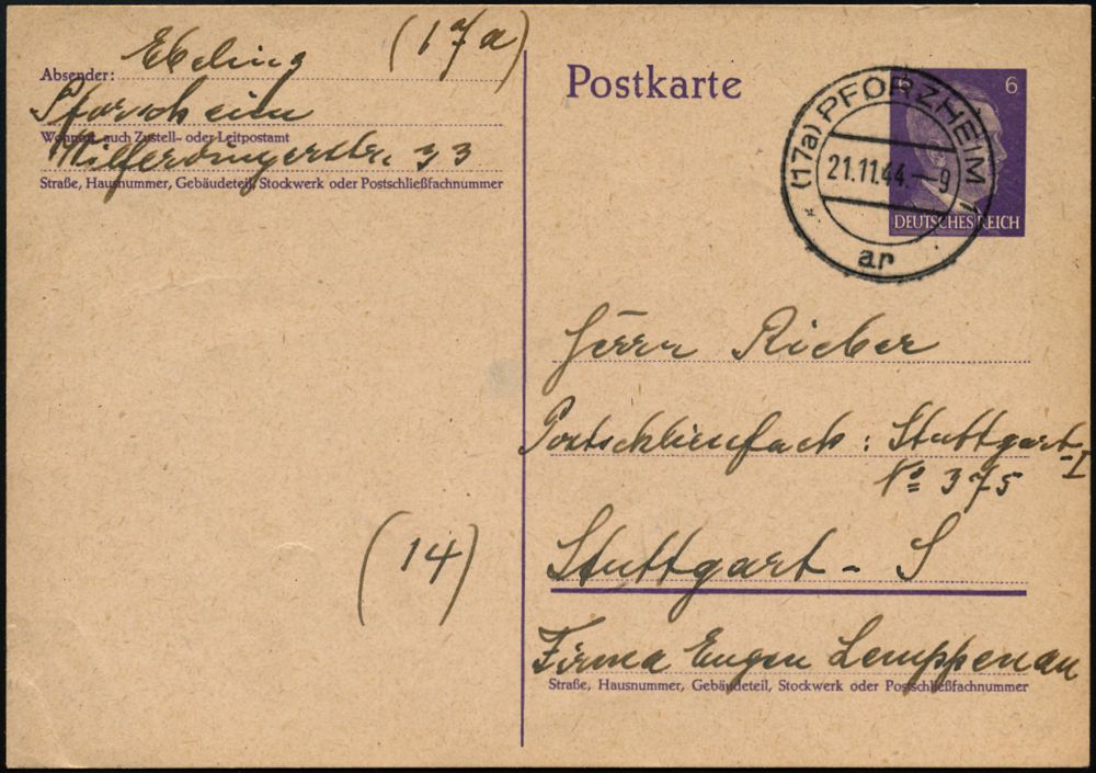 5215 | 18 € | 7530 PFORZHEIM : (17a) PFORZHEIM 1/ ar 1944 (21.11.) 2K-Steg mit Postleitzahl klar auf Inl.-P 6 Pf. Hitler, Bedarfskt. nach (14) Stuttgart, relativ frühes Datum! (Mi.P 299 I mit PLGZ) | ![]() | |