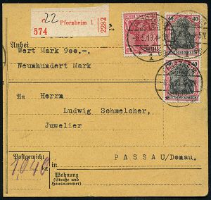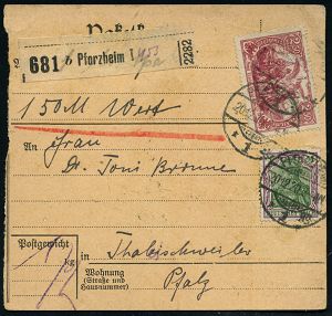 5207 | 20 € | 7530 PFORZHEIM : PFORZHEIM/ *1ee 1919 (6.5.) 1K-Gitterbrücke 3x + roter Wertpaketzettel: Pforzheim 1, hs. ergänzt "22" , klar gest. Inl.-Wertpaketkt. 900.- Mk. n. Passau (Mi.86 II, 2x 90 II) | ![]() | |