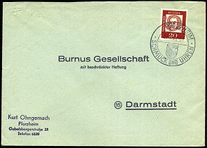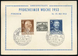 5217 | 18 € | 7530 PFORZHEIM : (17a) PFORZHEIM/ AUSSTELLUNG PFORZHEIMER WOCHE 1953 (17.5.) SSt 2x rs. auf Sonder-Kt.: PFORZHEIMER WOCHE , Fern-Kt., notopferbefreit n. West-Berllin (Bo.25) | ![]() | |