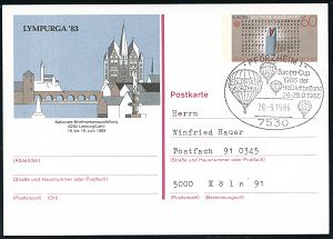 5221 | 5 € | 7530 PFORZHEIM : 7530 PFORZHEIM 1/ Europa-Cup/ ..der Heißluftballone 1986 (28.9.) SSt = 4 Ballone , klar gest. Inl.-Karte | ![]() | |