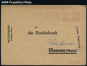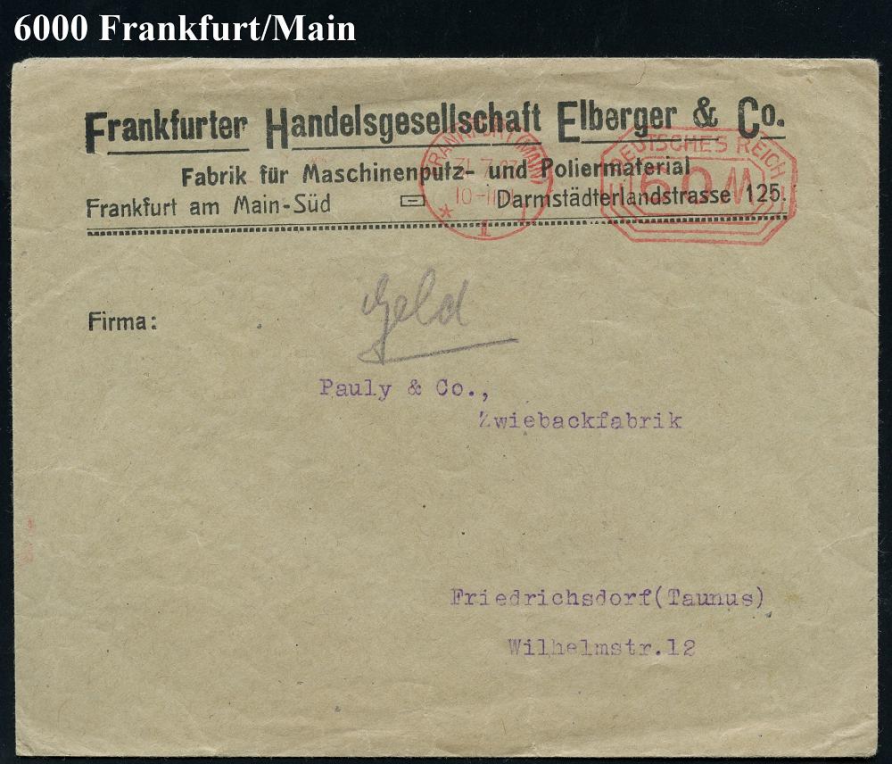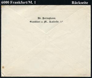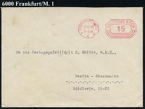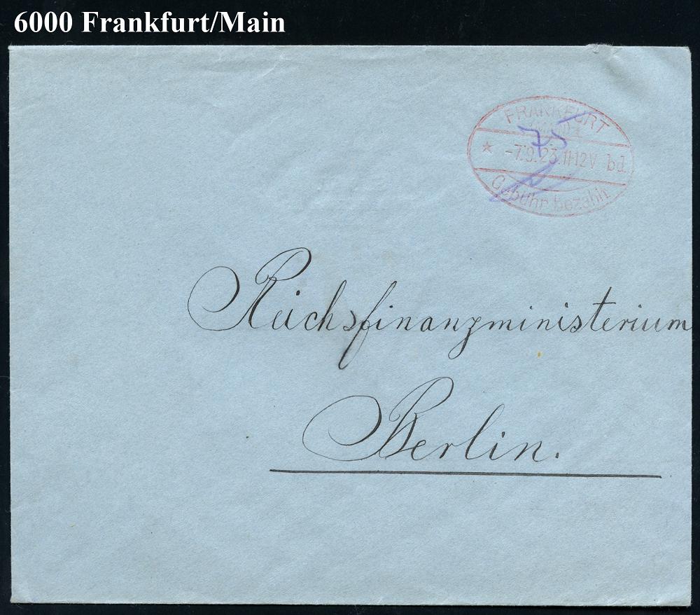 445 | 16 € | 6 Frankfurt/M. Post-Freistempel : FRANKFURT/ (MAIN) 1/ * bd/ Gebühr bezahlt 1923 (7.9.) PFS Brücken-Oval auf Infla-Firmen-Bf., rs. Abs.-Vordruck: S. & W. Katharinenpforte 3 n. Berlin an Reichsfinanzministerium (Dü.A 5, Nr.17) | ![]() | |