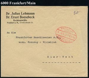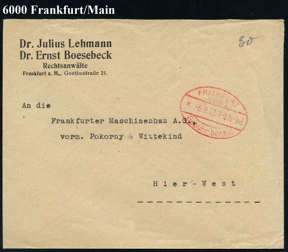 446 | 15 € | 6 Frankfurt/M. Post-Freistempel : FRANKFURT/ (MAIN) 1/ * bd/ Gebühr bezahlt 1923 (6.9.) PFS Brücken-Oval auf Firmen-Bf.: Dr. Julius Lehmanbn, Dr. Ernst Boesebeck, Rechtsanwälte.. , Infla-Orts-Bf. (Dü.A-5, Nr.17) | ![]() | |