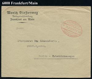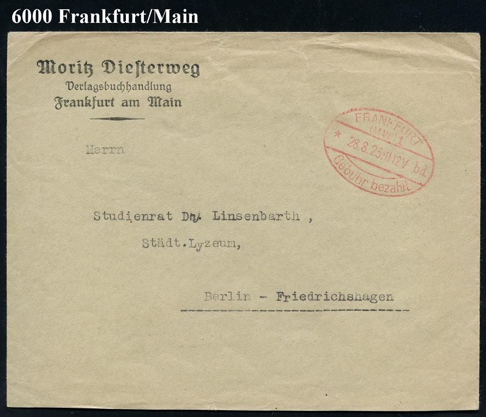 447 | 15 € | 6 Frankfurt/M. Post-Freistempel : FRANKFURT/ (MAIN) 1/ * bd/ Gebühr bezahlt 1923 (28.8.) PFS Brücken-Oval auf Infla-Firmen-Bf.: Moritz Diesterweg, Verlagsbuchhandlung.. n. Berlin (Dü.A-15, Nr.17) | ![]() | |