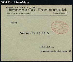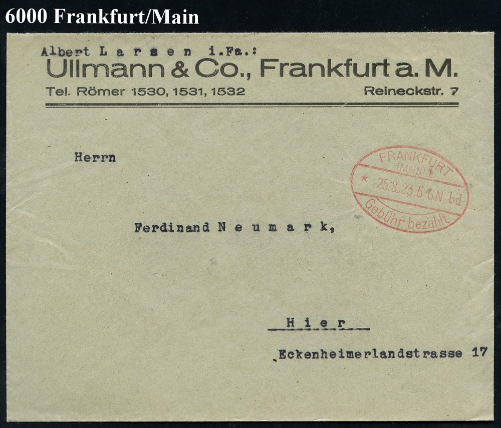 448 | 15 € | 6 Frankfurt/M. Post-Freistempel : FRANKFURT/ (MAIN) 1/ * bd/ Gebühr bezahlt 1923 (25.8.) PFS Brücken-Oval auf Infla-Firmen-Orts-Bf.: Ullmann & Co... (Dü.A-5, Nr.17) | ![]() | |