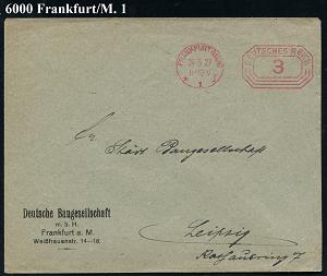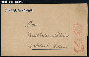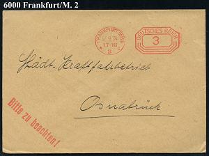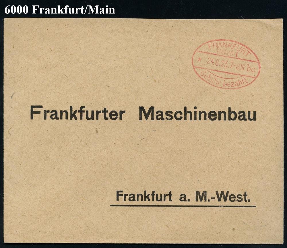 449 | 16 € | 6 Frankfurt/M. Post-Freistempel : FRANKFURT/ (MAIN) 1/ * b c/ Gebühr bezahlt 1923 (24.8.) PFS Brücken-Oval auf Infla-Orts-Bf.: Frankfurter Maschinenbau.. (Dü.A-5, Nr.17 UB "b c") | ![]() | |