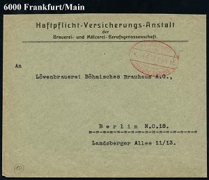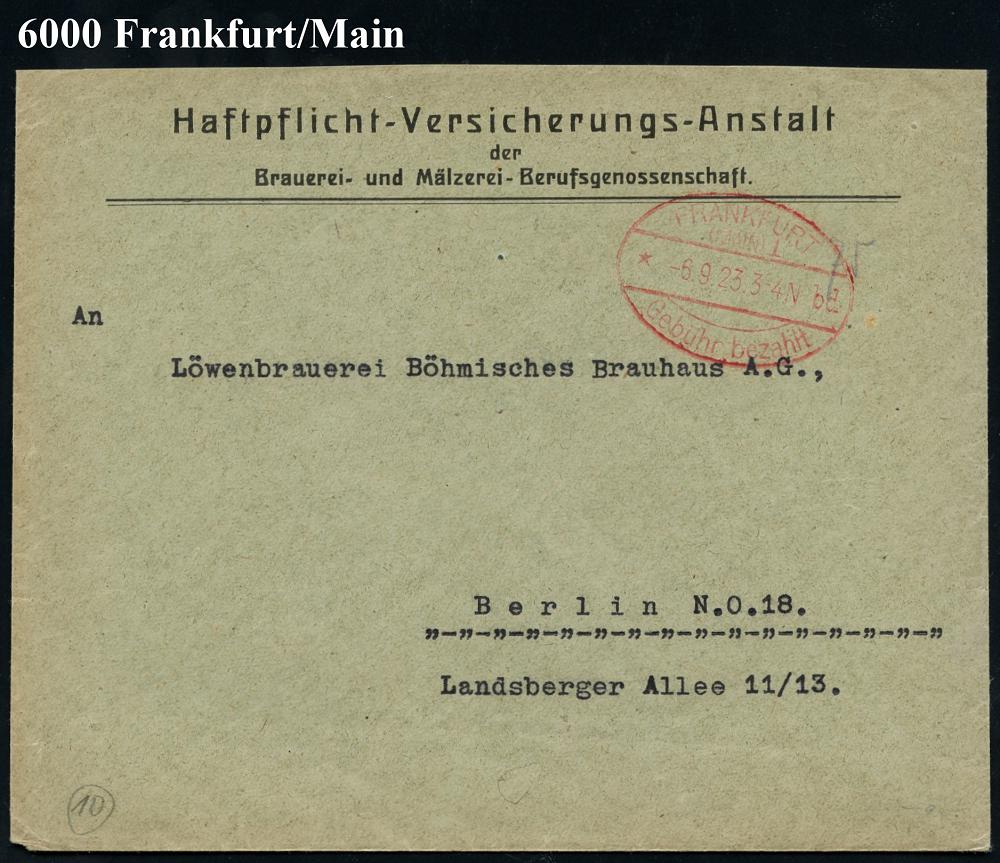 450 | 15 € | 6 Frankfurt/M. Post-Freistempel : FRANKFURT/ (MAIN) 1/ * bd/ Gebühr bezahlt 1923 (6.9.) PFS Brücken-Oval auf Infla-Firmen-Bf.: Haftpflicht-Versicherungs-Anstalt der Brauerei- u. Mälzerei-Berufsgenossenschaft (Dü.A-5, Nr.17) | ![]() | |