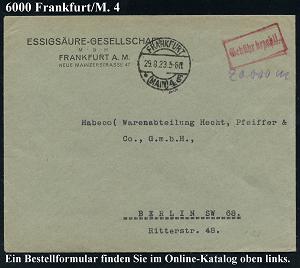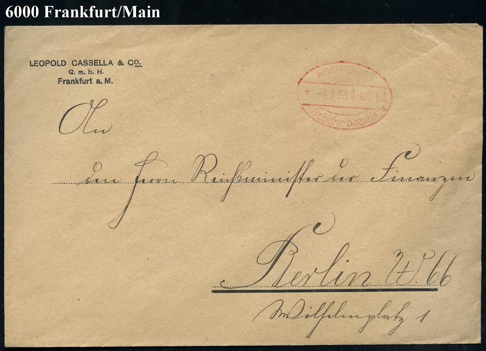 451 | 16 € | 6 Frankfurt/M. Post-Freistempel : FRANKFURT/ (MAIN) 1/ * bd/ Gebühr bezahlt 1923 (4.9.) PFS Brücken-Oval auf Infla-Firmen-Bf.: LEOPOLD CASELLA & Co (= Chemie-Firma) an Finanzministerium, Berlin (Dü.A-5, Nr.17) | ![]() | |