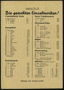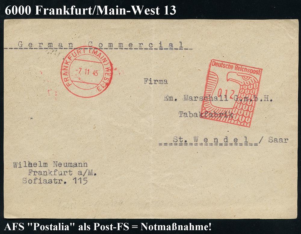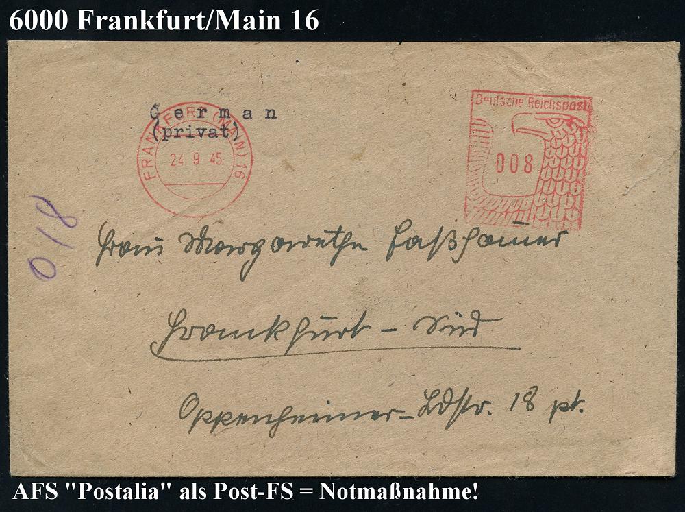 459 | 40 € | 6 Frankfurt/M. Post-Freistempel : FRANKFURT (MAIN) 16 #bzw.# WEST 13 #bzw.# FECHENHEIM 1945 (Sept.-Dez.) 3 verschiedene AFS Postalia "Reichsadler / Deutsche Reichspost" unverändert als Schalter-Freistempel weiterverwendet, Werbeklischee entfernt = Notmaßnahme! , Orts-Bf. (rs. fehlt Klappe u. Riß geschl.), 2 Vorderseiten (Einzelverkauf möglich: je 16.- EUR), 3 Belege (Dü.E-9, unverändert !) | ![]() ![]() ![]() | |