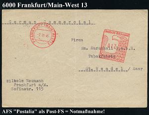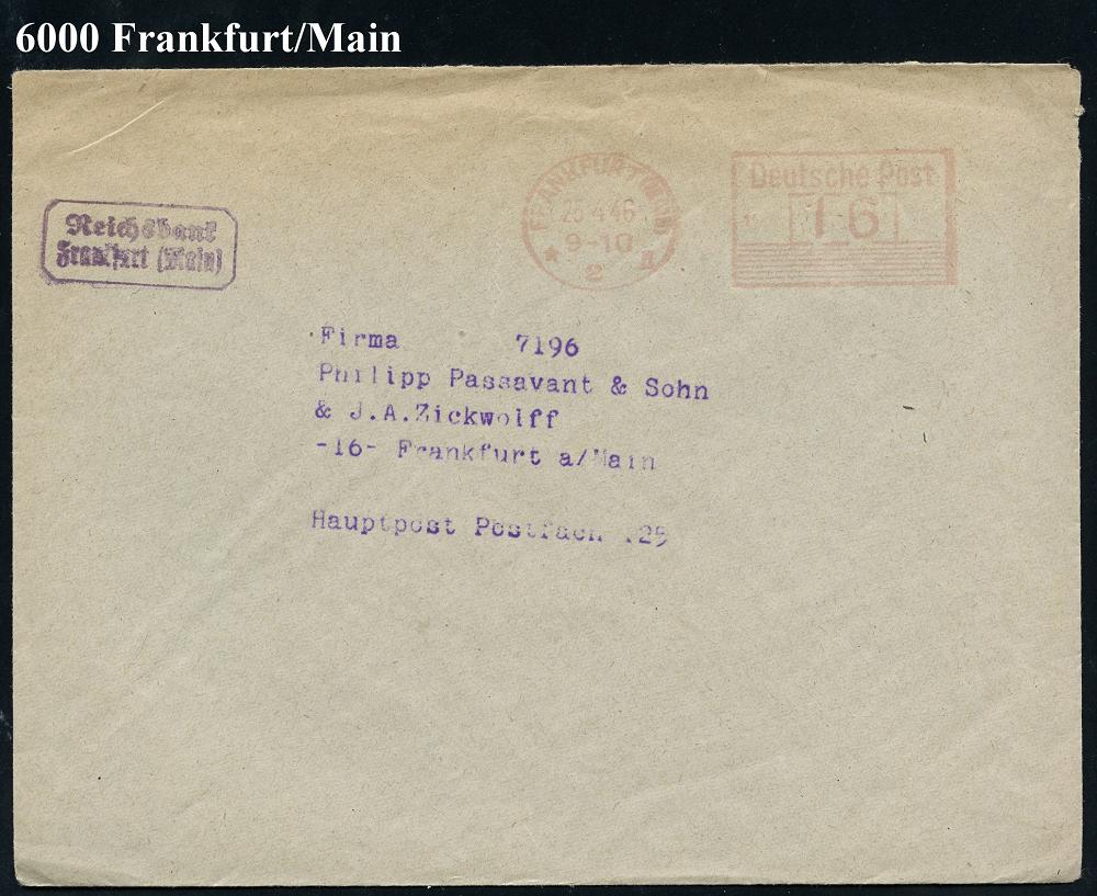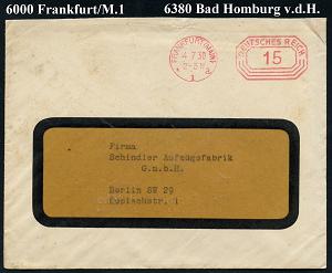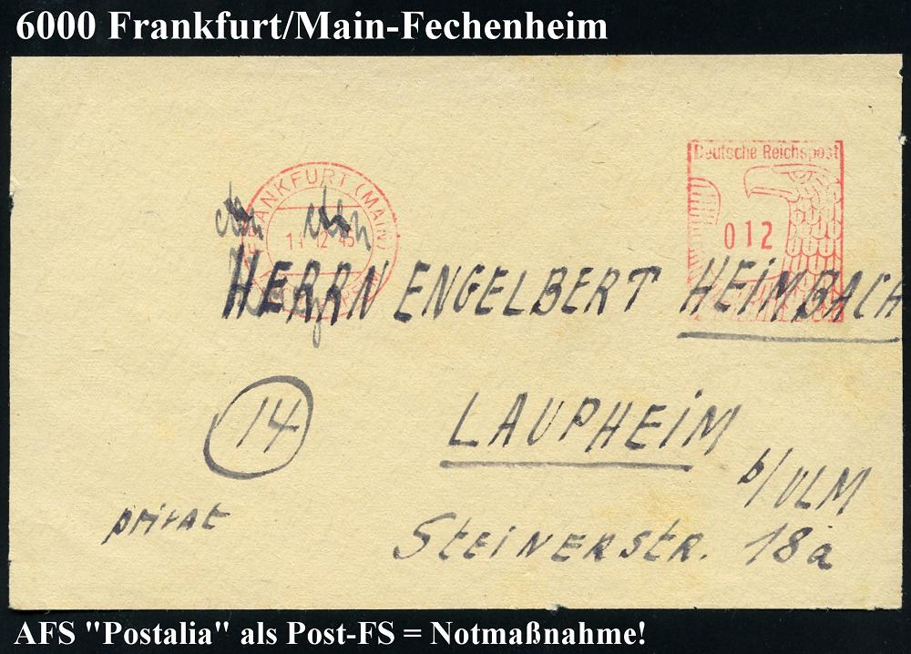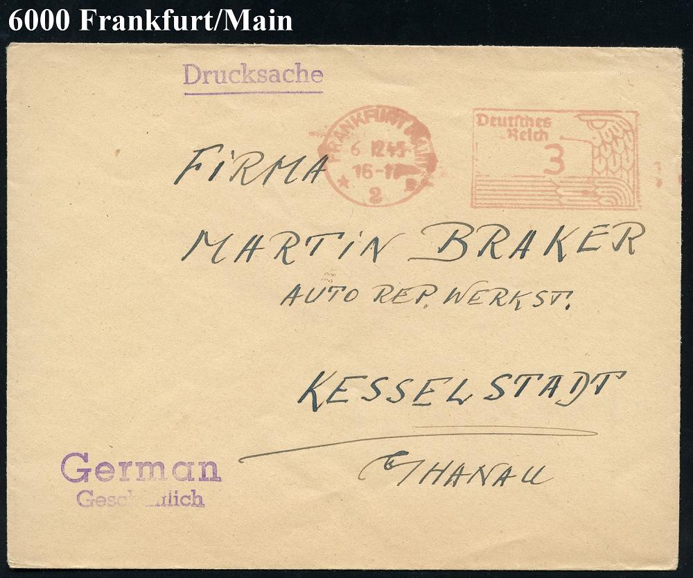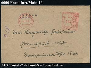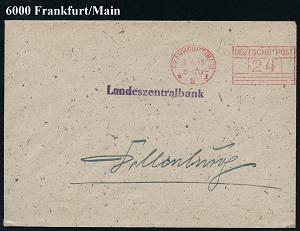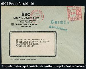 463 | 25 € | 6 Frankfurt/M. Post-Freistempel : FRANKFURT (MAIN) 16/ Deutsche Reichspost 1945 (12.12.) aptierter AFS "Postalia" noch alter "NS-Adler" ohne Werbeklischee (oben gering nicht voll) als Notentwertung auf Orts-Firmen-Bf.: BBC BROWN, BOVERI & CIE.. (APFS-42 G) | ![]() | |