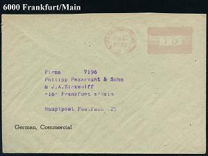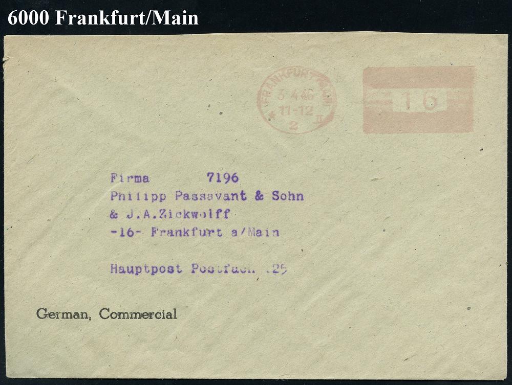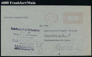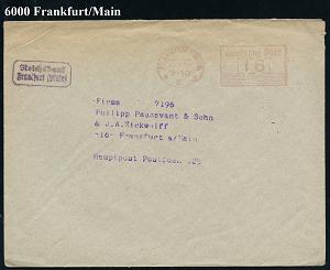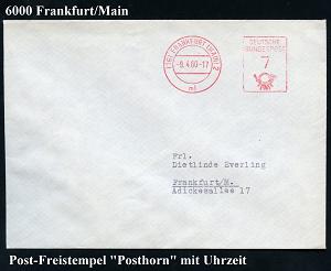 476 | 5 € | 6 Frankfurt/M. Post-Freistempel : (16) FRANKFURT (MAIN) 2/ ml/ DEUTSCHE/ BUNDESPOST 1960 (9.4.) Maschinen-PFS 7 Pf. Posthorn mit Uhrzeitangabe , rs. Monogr. "E M F", Orts-Drs. (Dü.D-17, alte PLZ) | ![]() ![]() | |