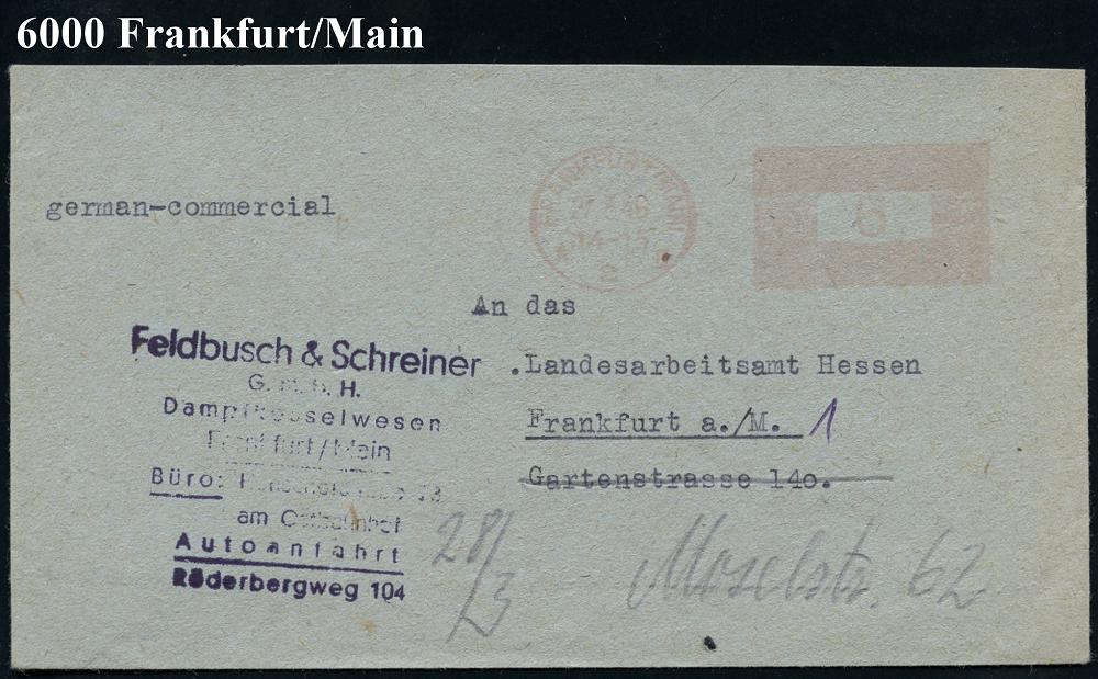465 | 15 € | 6 Frankfurt/M. Post-Freistempel : FRANKFURT (MAIN)/ *2II 1946 (27.3.) total aptierter PFS 6 Pf. "Adlerkopf/Hakenkreuz", abgeschliffen = Notmaßnahme! (wie immer etw. schwach) + Abs.-HdN: Feldbusch & Schreiner GmbH Dampfkessel.., nachgesandter Orts-Bf. (Dü.D-8, Nr.242) | ![]() | |