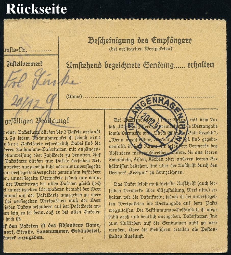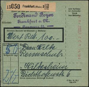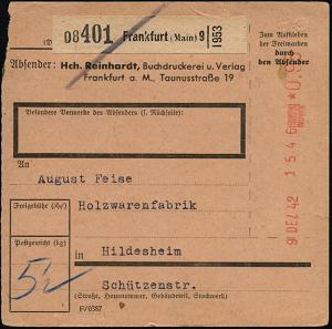 458 | 16 € | 6 Frankfurt/M. Post-Freistempel : FRANKFURT/ (MAIN)9C 1942 (9.12) roter Registrierkassen-Paket-FS Typ "Anker" *0.75 (RM) + NS-Prägeadler vertikal + schw. Paketzettel: Frankfurt (Main) 9, Inl.-Paket-Kt.. n. Hildesheim (Dü.H-1A/2) | ![]() | |