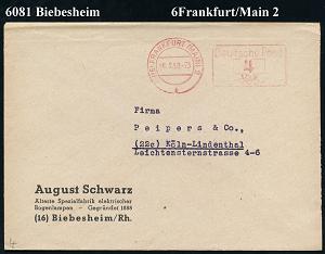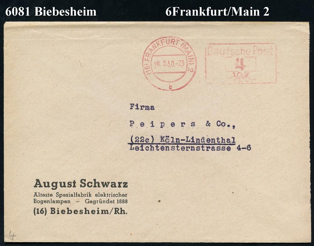 474 | 8 € | 6 Frankfurt/M. Post-Freistempel : (16) FRANKFURT (MAIN) 2/ b/ Deutsche Post 1950 (28.2.) Maschinen-PFS 4 Pf. Posthorn auf Firmen-Bf.: August Schwarz,, elektr. Bogenlampen - Gegr. 1888 (Dü.D-14, Nr.266) | ![]() | |