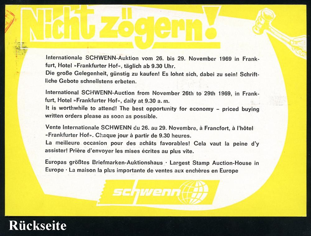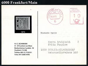 481 | 10 € | 6 Frankfurt/M. Post-Freistempel : 6 FRANKFURT AM MAIN 2/ mb 1969 (18.11.) Maschinen-PFS 10 Pf. Posthorn ohne Uhrzeit , Reklame-Kt.: H. C. SCHWENN.. mit Bayern Nr.1 (Dü.D-17, neue PLZ) | ![]() ![]() | |