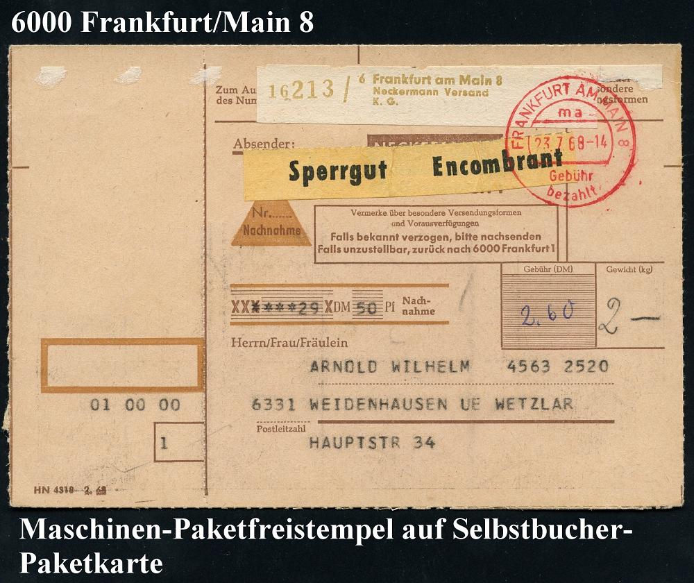 480 | 18 € | 6 Frankfurt/M. Post-Freistempel : FRANKFURT AM MAIN 8/ ma/ Gebühr/ bezahlt 1968 (23.7.) 1K-Paket-FS ohne PLZ mit Uhrzeit (1K-Segment) + brauner Selbstbucher-Paketzettel: 6 Frankfurt am Main 8/ Neckermann Versand/A.G. + Label: Sperrgut Encombrant , klar gest. Inl.-NN-Selbstbucher-Paketkarte (zweiteilig) mit Zusatz "Sperrgut" (Dü.-Eich unbekannte Type) | ![]() ![]() | |