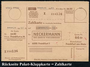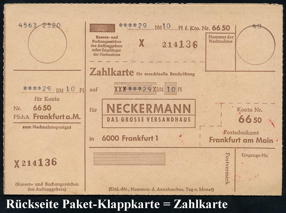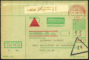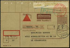478 | 18 € | 6 Frankfurt/M. Post-Freistempel : FRANKFURT AM MAIN 8/ ma/ Gebühr/ bezahlt 1964 (Jan.) Maschinen-Paket-FS (1K-Segment) "Gebühr bezahlt" ohne PLZ + brauner Selbstbucher-Paketzettel: Frankfurt am Main 8/Neckermann Versand/K.G., Inl.-Selbstbucher-NN-Postgut-Paketkt. (Dü.-Eich: unbekannte Type) | ![]() | |