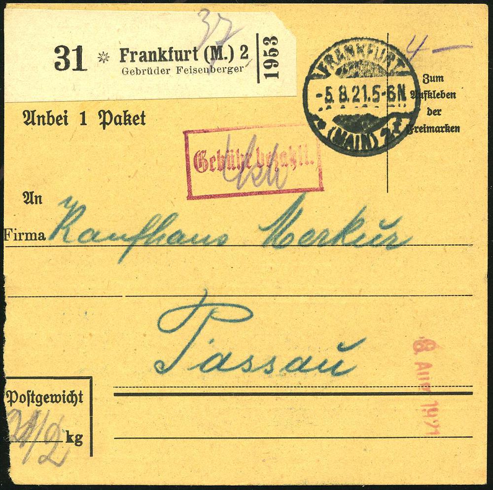 439 | 18 € | 6 Frankfurt/M. Post-Freistempel : FRANKFURT/ *(MAIN)2/ f 1921 (5.8.) 1K-Gitter + roter Ra.: Gebühr bezahlt + schw. Selbstbucher-Paketzettel: Frankfurt (M.) 2/Gebrüder Feisenberger , klar gest. Inl.-Selbstbucher-Paketkt. (n. Passau) | ![]() | |